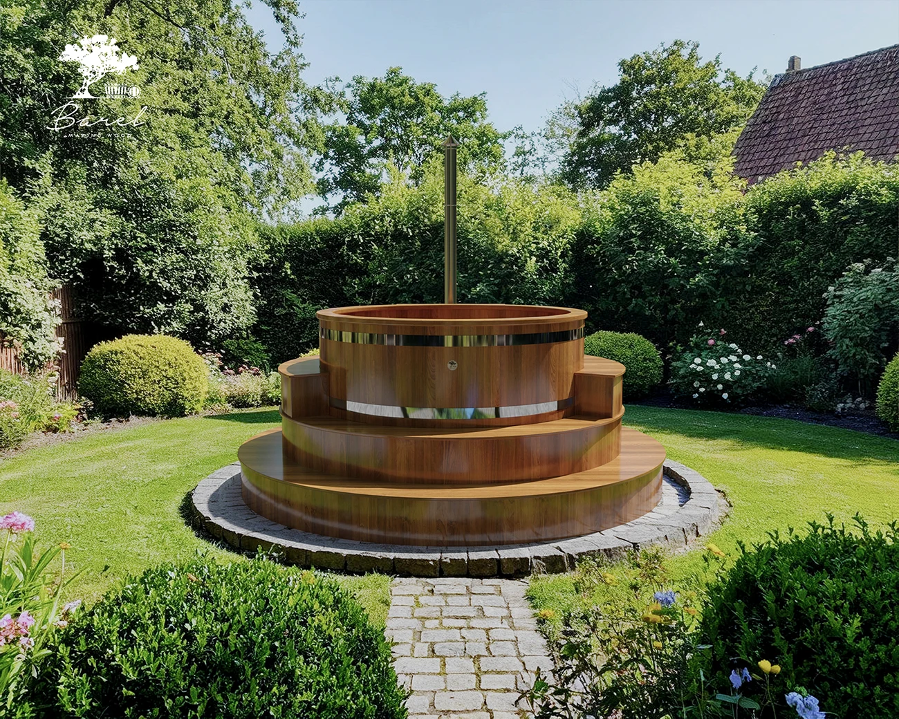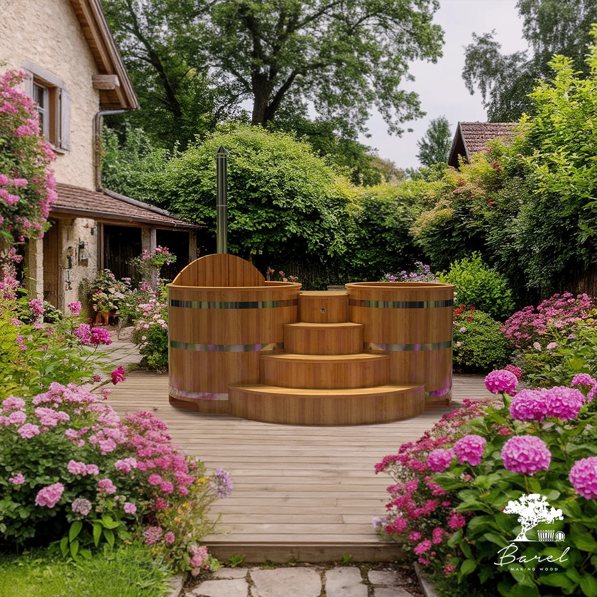 Хоть дровяная печь и забирает небольшой сектор вместилища для купания, с эстетической точки зрения такое расположение печи выигрывает у купели с внешним расположением печи, а также имеет удобный подход для ее эксплуатации и имеет более компактное расположение на участке.